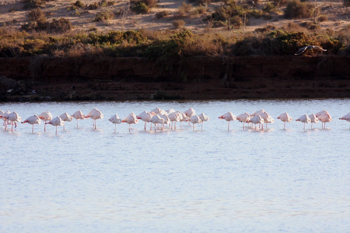 Yellow legged, Lesser Black backed and Audouin's Gulls were around the shore plus a large group of Oystercatchers, one each of Common and Green Sandpiper and the inevitable Sanderlings, their quicksilver movements across the sand betraying their identity from afar, and two immature Slender billed Gulls in amongst a small group of Black headed Gulls was a nice find. Sandwich Terns were fishing in the estuary and one of two Ospreys we saw, flew upriver carrying a huge fish whilst being vigorously mobbed by two Yellow legged Gulls. A group of some eighty four Greater Flamingoes roosted, a swathe of delicate pink, in the middle of the river shallows.
