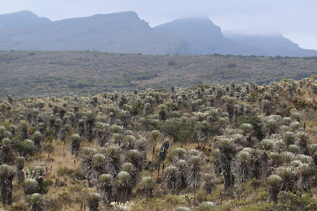 I felt familiar with this landscape of barren rocks and wild moor albeit with a very different flora. Not too dissimilar to Sutherland and Caithness in my ancestral home of northern Scotland, Sumapaz Paramo National Park in the Cundiboyacense Mountain Range is considered to be the largest paramo ecosystem to be found anywhere in the world, comprising 178,000 hectares and was established in 1977.  Paramo de Sumapaz translates as 'Utterly peaceful moorland' which seems reasonably appropriate but is maybe a trifle misleading as it also has a cold inhospitable climate with temperatures ranging from minus ten degrees to plus seventeen degrees celsius and with rapid changes from warm to freezing cold. The ground is wet and covered by shallow bodies of water and sticky mud called Chupaderos, often hidden under dense flat vegetation and a trap for the unwary visitor. An estimated 1200 families live in the Sumapaz Paramo, most of them existing  below the poverty line, living on less than $1.25 per day and without schools or sanitation, with the consequence that just to survive they have to indulge in illegal logging and grazing of cattle which impacts on the Park.