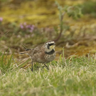 The Horned Lark is a female and as such does not have the strong face patterning and obvious feathered horns of a male. Rather its head is a suffusion of yellow and white with ill defined black head and breast markings but with the obvious white forehead and supercilium that mark it out as so different. The rest of the plumage did not seem to have changed much from the last time we saw it. Maybe the breast streaking was a little more sharp and the dark streaks on its unremarkable brown upperparts were stronger.The fore flanks and mantle had also taken on a not unattractive pinkish brown blush.