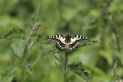 This large and rare insect of such exotic beauty looked incongruous, crowning as it did the unlikely top of a humble nettle. It stayed there for less than a minute and then took flight again, to circle as before, frustratingly teasing as it flew high and then low and made several false landings but then it settled once more for slightly longer, maybe just over a minute and then it was gone, up into the air and high over the tree tops towards the adjacent 'Doctor's Garden'. It returned a couple more times, never settling and then came no more.