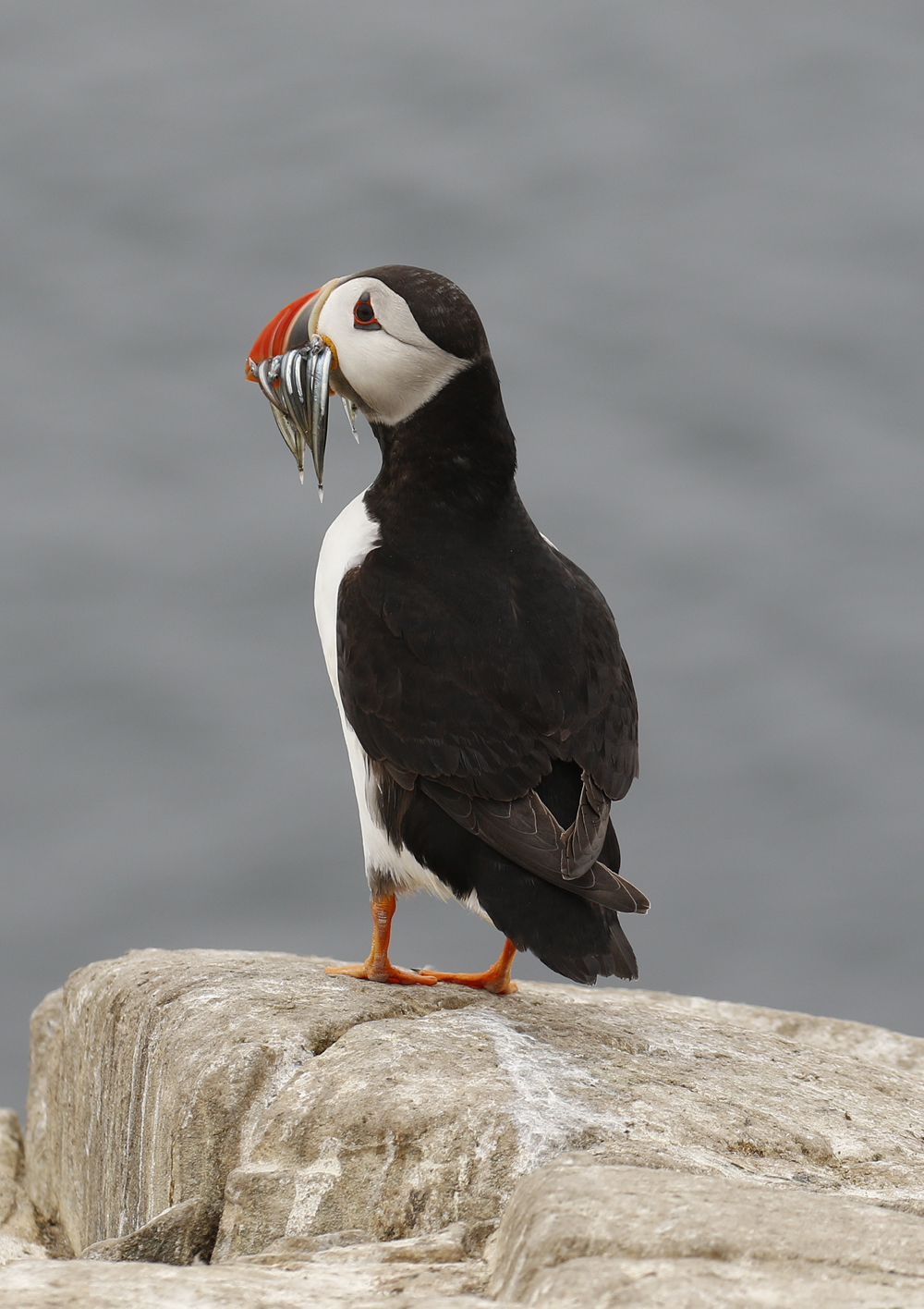 Regularly, Puffins with small silvery sandeels arranged neatly crosswise in their bill would alight on the smooth flat rocks between me and the Guillemots. Here they were, for some reason unmolested by the gulls possibly due to my and others close presence and presumably they felt safe, and would remain here for a minute or so before flying to their burrow. It is always a source of amazement to me how Puffins manage to achieve the trick of holding so many fish in their bill at one time. First they have to catch the fish underwater, then align it in their bill and then go on to catch others and similarly retain them in their bill whilst catching another fish. Not only that but the fish are arranged alternately head to tail! I counted at least ten fish held this way in the bill of one bird.Truly it was amazing.