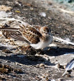 The sultry afternoon sun persuaded the Dunlin to rest and sleep but the Little Stint preferred to carry on feeding until it too grew tired and wandered up the concrete slope to join the Dunlin in repose. A sight that was enough to charm even the least sentimental of observers and offer a different perspective on a bird's life from one that is purely scientific and objective.