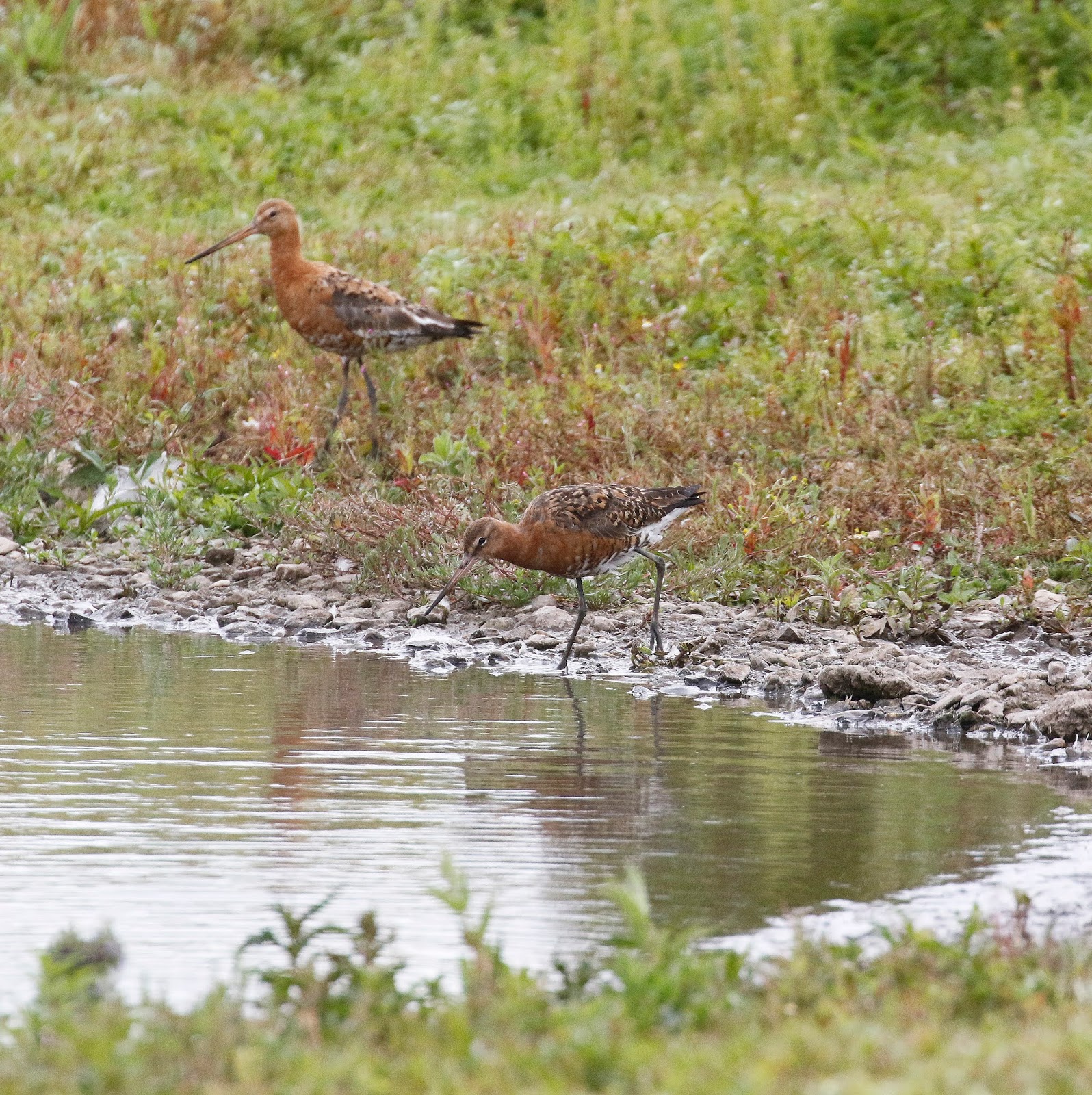| Two Black tailed Godwits. The individual at the back, is a male in full summer plumage and the bird in front almost moulted into full winter plumage |