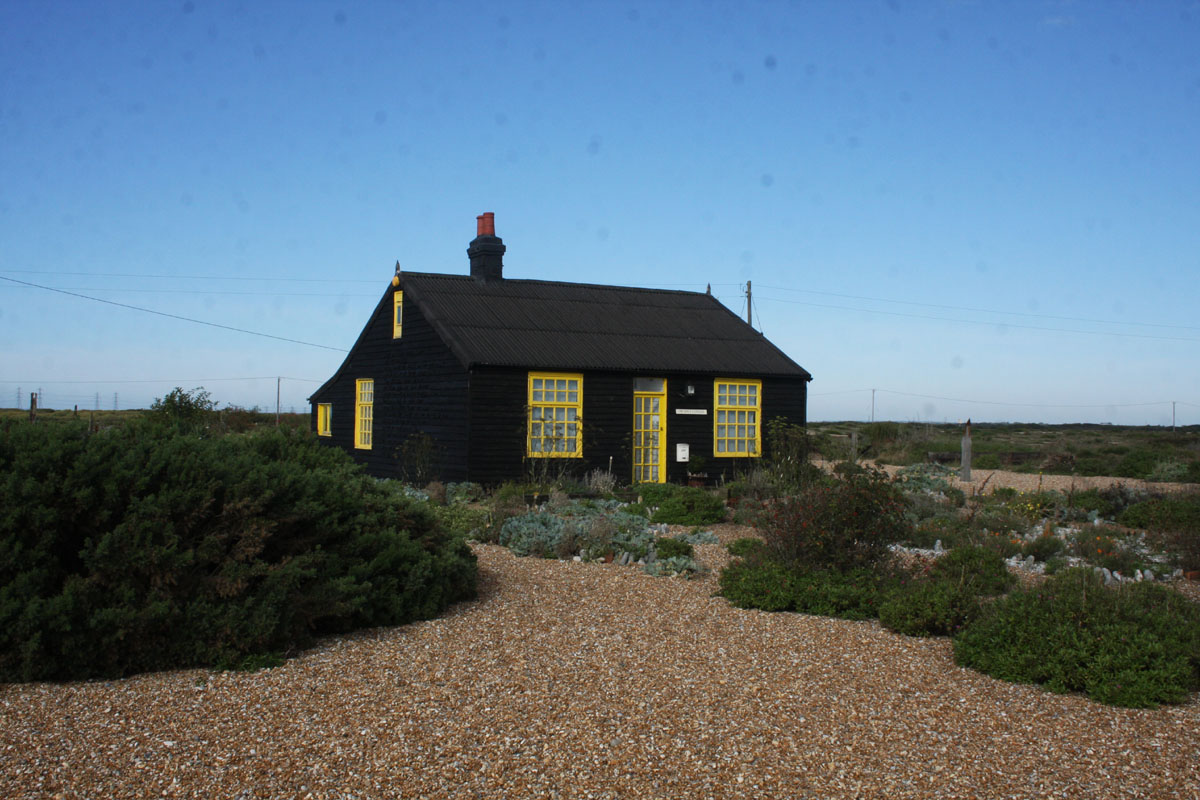 Derek Jarman's cottage and garden on a better day at Dungeness